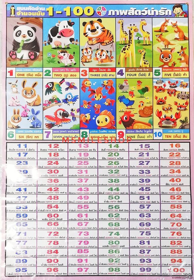 โปสเตอร์แบบหัดอ่านจำนวนนับ 1-100ภาพสัตว์น่ารัก ไทย-อังกฤษ
